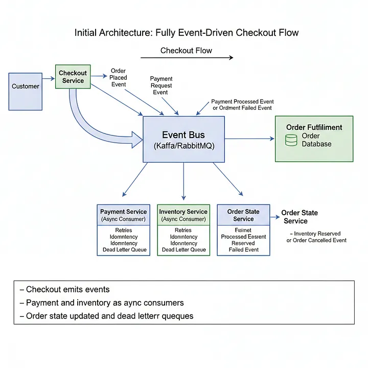 La mayoría de los debates se centraron en el orden de los eventos, los reintentos y el retraso de los consumidores. Ningún servicio era claramente responsable del resultado final de un pedido. Los fallos dejaban los pedidos en estados parciales que requerían una intervención manual.