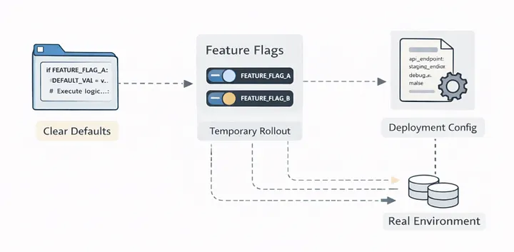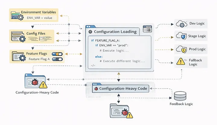 Las banderas de características, las variables de entorno y los múltiples archivos de configuración influían en la lógica central. La mayoría de los incidentes de producción no fueron causados por defectos en el código, sino por una configuración incorrecta.