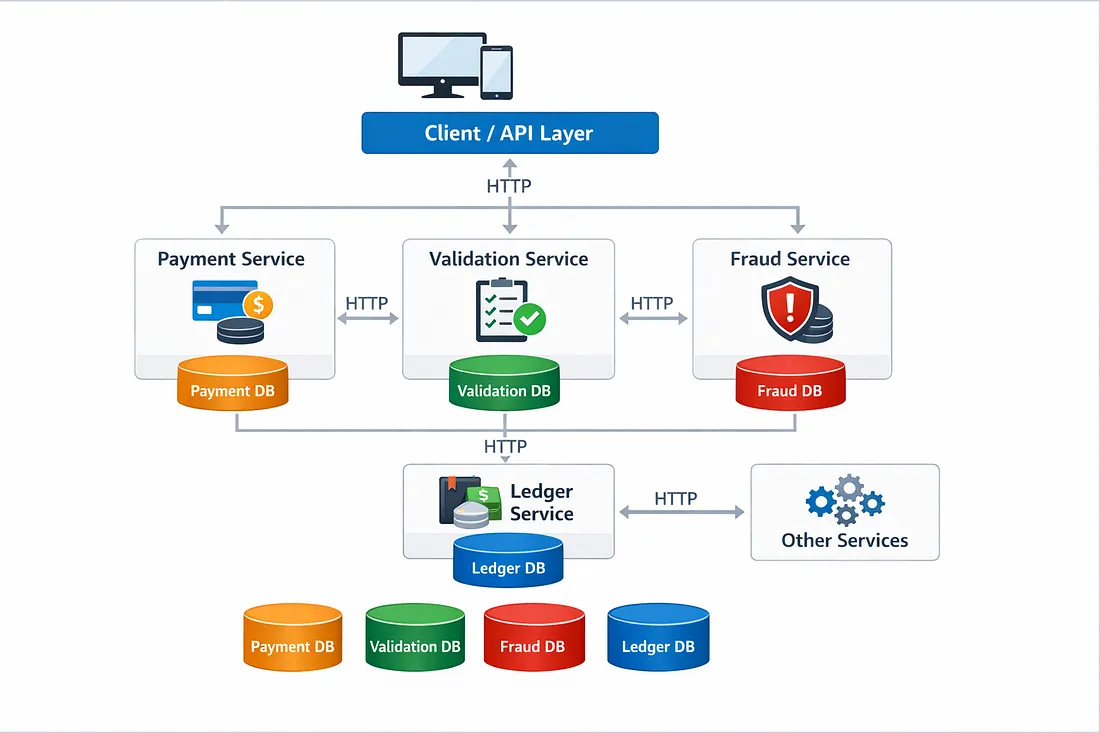 Incluso con poco tráfico, cada solicitud de pago genera múltiples llamadas a la red. Un fallo en cualquier servicio provoca que falle todo el pago.