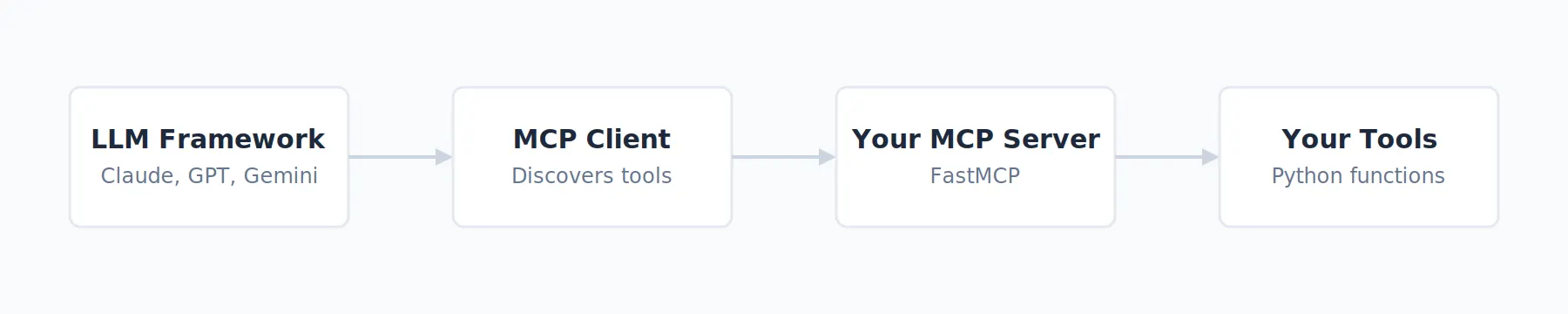 Se encarga de las tareas aburridas (detección, enrutamiento, serialización) para que puedas centrarte en lo que importa: las herramientas en sí. Tu función meteorológica, tu consulta de base de datos, tu remitente de correo electrónico.