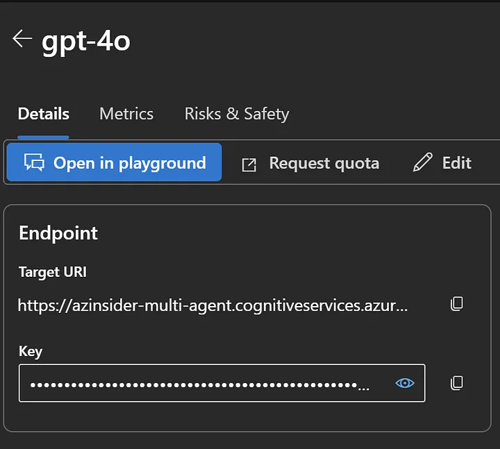 - Implementación del modelo — por ejemplo, una implementación de GPT-4o adjunta a su proyecto; las cuotas pueden variar según la región.