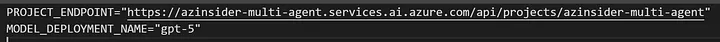 código .envEn el archivo de código, reemplace el marcador de posición your_project_endpoint con el punto de conexión de su proyecto (copiado de la página de información general del proyecto en el portal de Azure AI Foundry) y el marcador de posición your_model_deployment con el nombre que asignó a la implementación de su modelo GPT.
