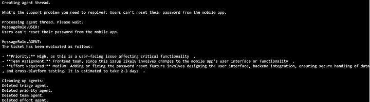 python agent_triage.py- Proporcione un problema real (por ejemplo, “Los usuarios no pueden restablecer su contraseña en la aplicación móvil”).
