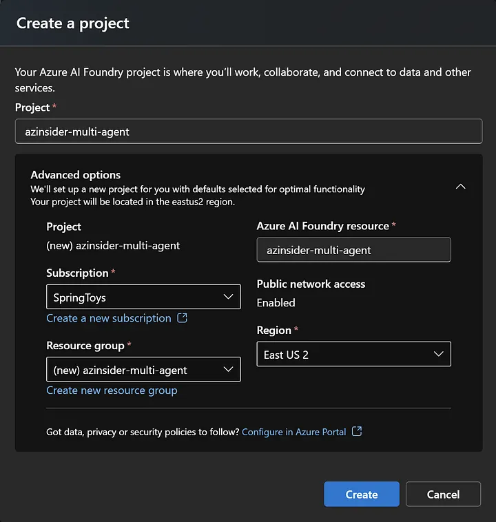 - Azure AI Foundry Project & Agent Service : el entorno de ejecución administrado que gestiona subprocesos, llamadas a herramientas, seguridad, identidad y observabilidad para sus agentes.