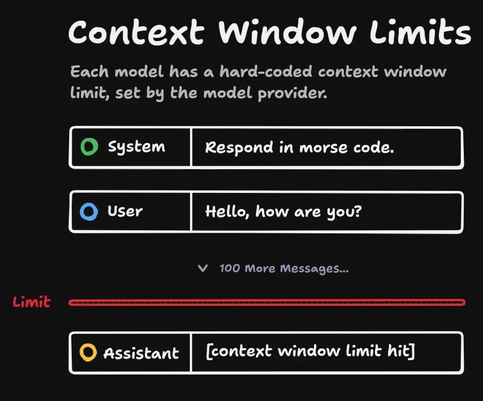 Verás un error como «ventana de contexto excedida» o tu modelo simplemente se detendrá a mitad de la salida. Incluso una sola carga de archivo de gran tamaño o una base de código larga pueden hacer que se supere el límite.