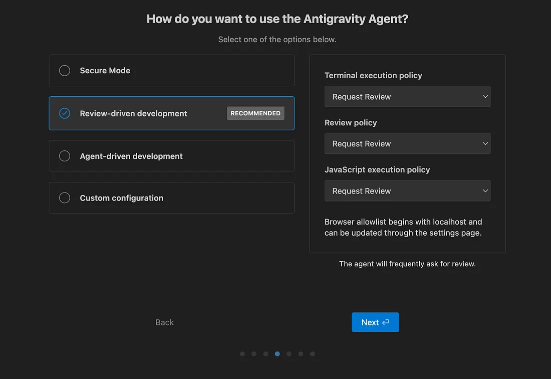 Antigravity ofrece cuatro preajustes basados en las políticas anteriores. La opción recomendada es Desarrollo asistido por agente (desarrollo basado en revisiones), ya que equilibra la eficiencia con la seguridad.