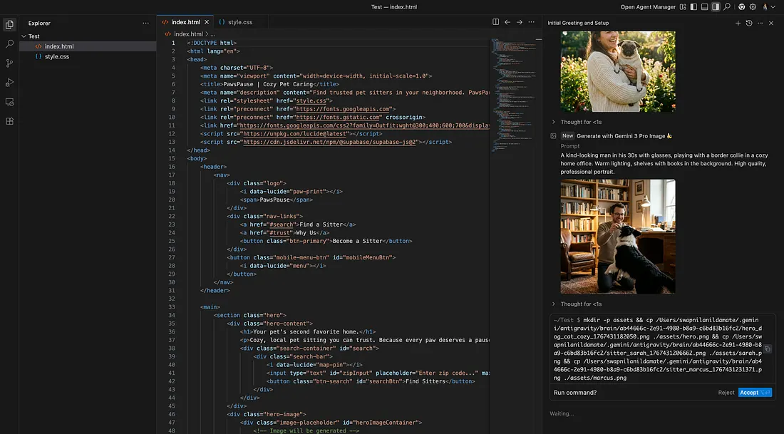 - El agente diseñador comenzó a generar una cálida paleta de colores «Golden Retriever». Vi una vista previa en directo mientras una cuadrícula CSS se montaba como un rompecabezas digital.