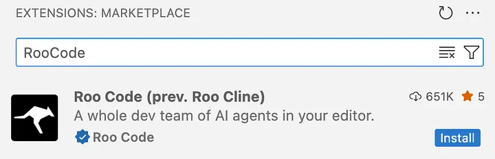 1. Instala RooCode desde el mercado de VS Code buscando «RooCode» en la vista Extensiones (Ctrl+Shift+X) y haciendo clic en «Instalar».